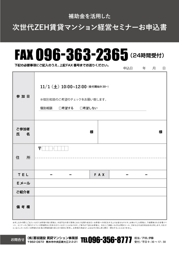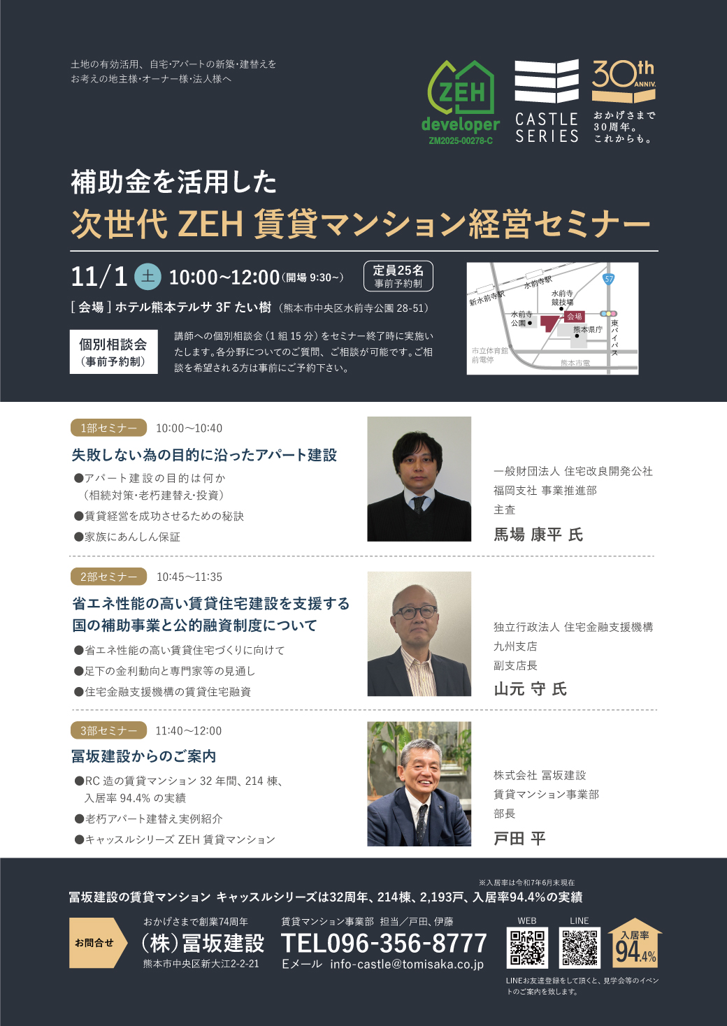 11月1日(土)AM10:00~AM12:00ホテル熊本テルサ3階「たい樹」(熊本市中央区水前寺公園28‐51)にて、補助金を活用した次世代ZEH賃貸マンション経営セミナーを開催いたします。