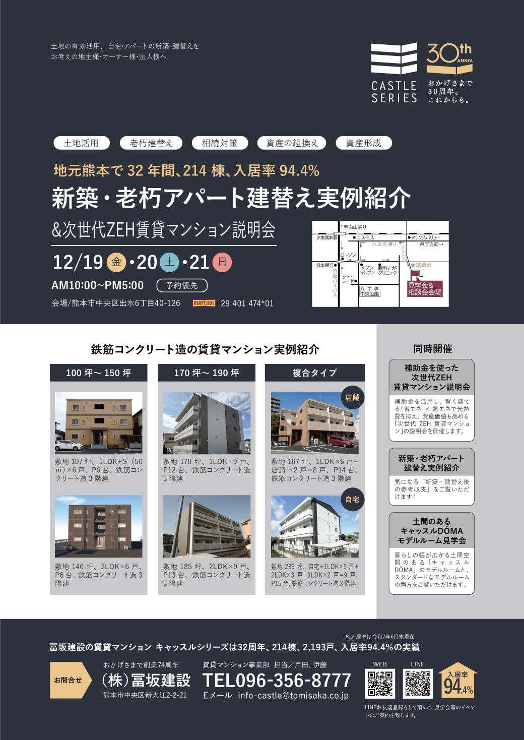 【12/19~21開催】新築・老朽アパート建替え実例紹介&次世代ZEH賃貸マンション説明会(熊本市)